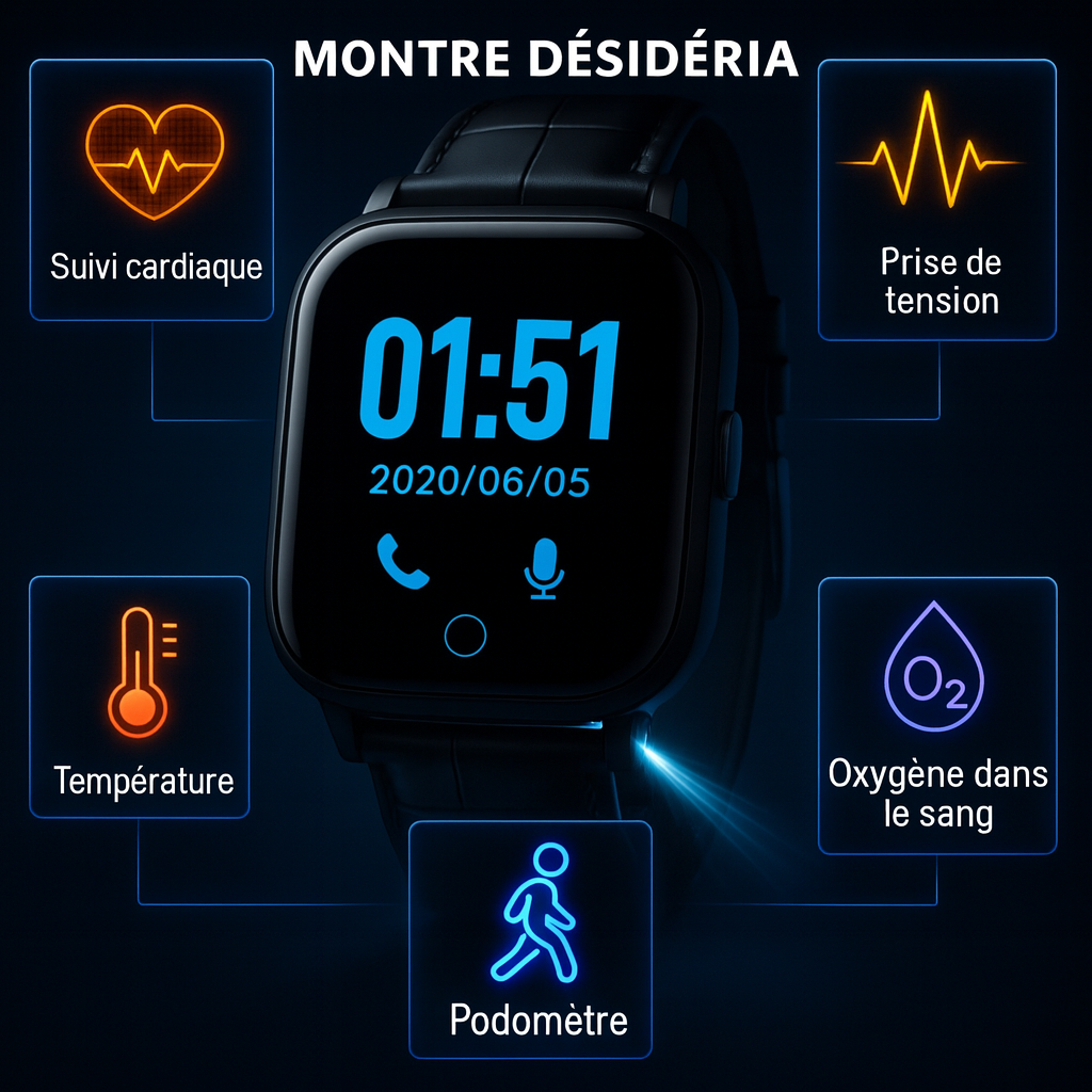 le rappel de sédentarité, le réveil, l'appareil photo, l'album photo, la vidéo, les messages vocaux, la calculatrice, le calendrier, la lampe torche, etc